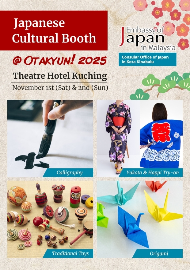 “Otakyun! 2025”, which is one of the largest Japanese pop-culture (e.g., anime, manga, idol, and games) events in East Malaysia, will be held in Kuching, Sarawak on the following dates. The Consular Office of Japan in Kota Kinabalu will set up a booth introducing traditional Japanese culture such as origami, calligraphy (shodo), traditional toys, Yukata and Happi and so on at the event.
